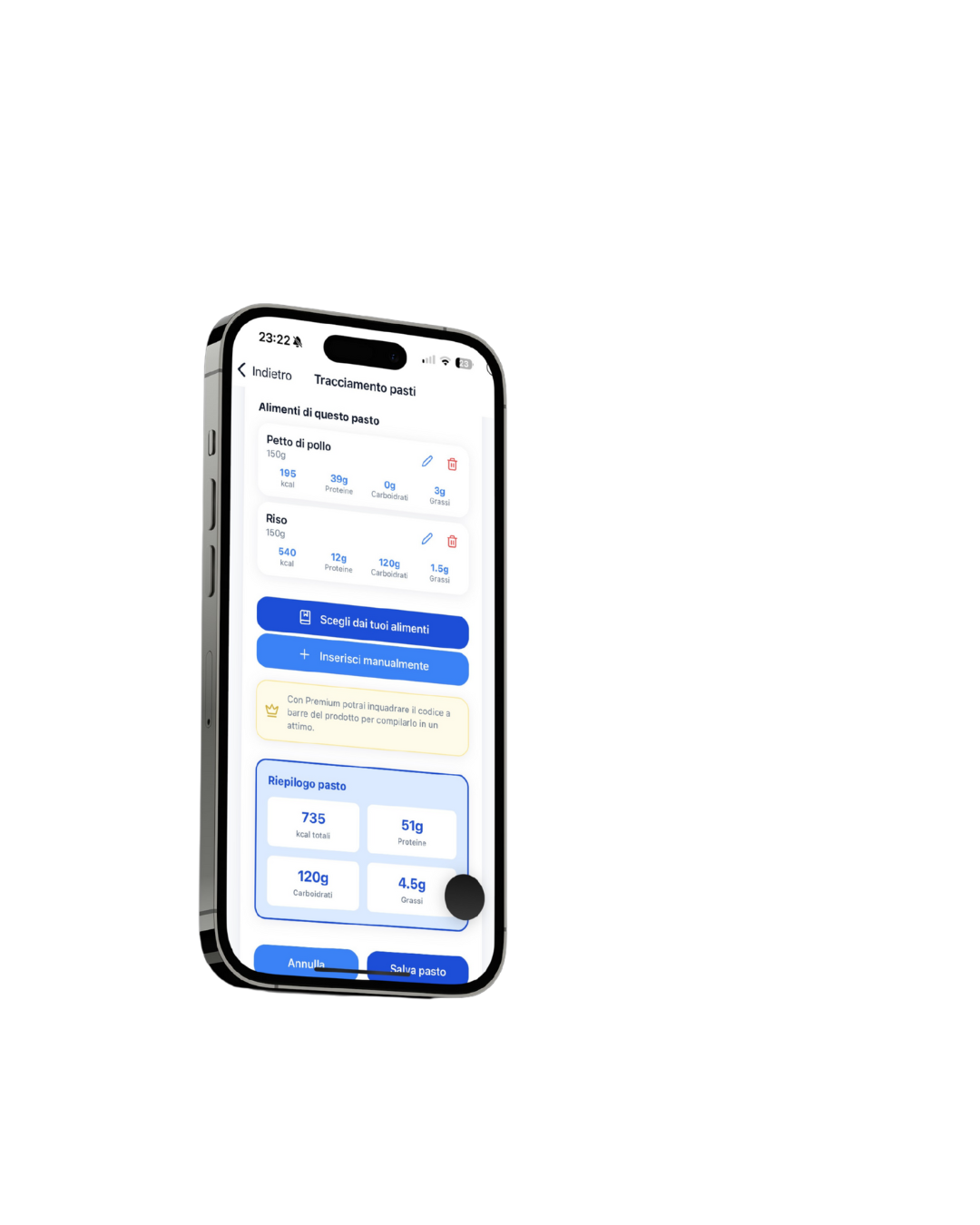 - Inserimento manuale o con scan del codice a barre degli alimenti con calorie e